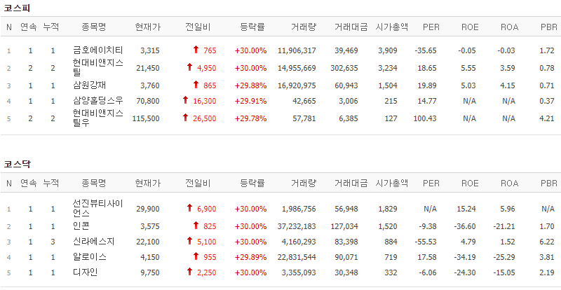 코스피에서는 금호에이치티, 현대비앤지스틸, 삼원강재, 삼양홀딩스우, 현대비앤지스틸우가 상한가를 기록했고, 코스닥에서는 선진뷰티사이언스, 인콘, 신라에스지, 알로이스, 디자인이 상한가를 기록했습니다.