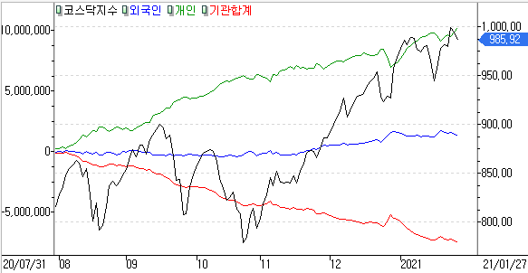 코스닥 개인 +3,670억 / 외국인 -1,509억 / 기관 -1,915억