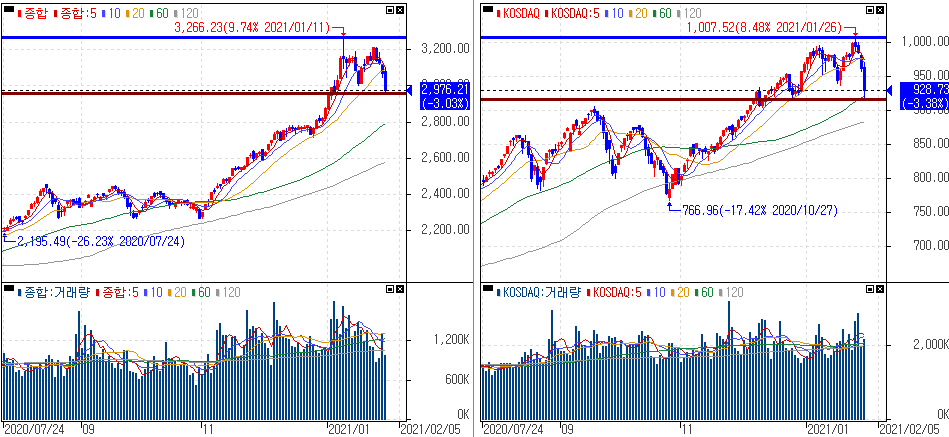 금일 코스피 지수는 -3.03% 하락한 2,976.21에 마감하였고, 코스닥 지수는 -3.38% 하락한 928.73에 마감하였습니다. 미리 준비하지 못한 투자자들의 손실폭이 커지는 모습이 연출되고 있습니다. 반등을 보이면서 좋겠지만 호전되지 않는다면 반대매매에 우려까지 볼 수 있습니다.