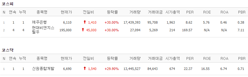코스피에서는 제주은행, 현대비앤지스틸우가 상한가를 기록했고, 코스닥에서는 신원종합개발에서 상한가를 기록했습니다.