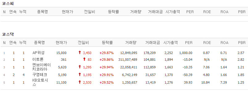 코스피에서는 상한가 종목이 없었고, 코스닥에서는 AP위성, 이트론, 엔브이에이치코리아, 구영테크, KB오토시스가 상한가를 기록했습니다.