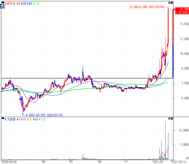우주산업 성장 기대감 지속에 따르는 우주항공산업 테마주 강세 속 상한가를 기록한 AP위성 주가 입니다. 한국항공우주(KAI)에서는 우주산업 선제 대응을 위한 '뉴 스페이스 태스크포스팀(TF)'을 어제 출범시켰습니다.