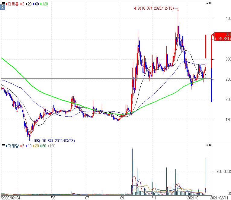 러시아 백신 긍정적 효능 발표에 위탁생산 업체 투자 사실 부각 되면서 상한가를 기록한 이트론 주가 입니다. 러시아가 개발중에 있는 코로나19 백신 '스푸트니크V'가 임상 3상 결과에서 91.6% 에방효과가 나타났다는 소식이 나왔습니다. 1차와 2차 접종을 마친 19,866명의 면역효과에는 91.6% 확인되었고, 60세 이상의 2,144명의 임상결과에서도 91.8% 면역효과가 나왔습니다.