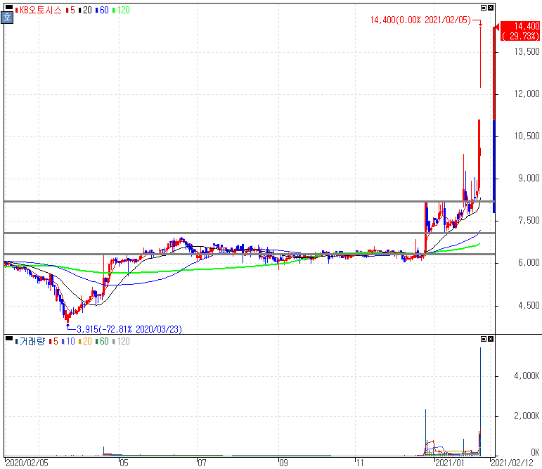 美 조지아주 공장 건설 소식에 2거래일 연속 상한가를 기록한 KB오토시스 주가 입니다. 애플이 기아차만 아니라, 일본업체 등 최소 6개 업체와 교섭 진행하고 있다는 소식에도 불구하고 약 420억원을 투입해 부품 공장을 건설한다는 것으로 어제 상한가에 이어 오늘도 연속 상한가를 기록한 KB오토시스 입니다.
