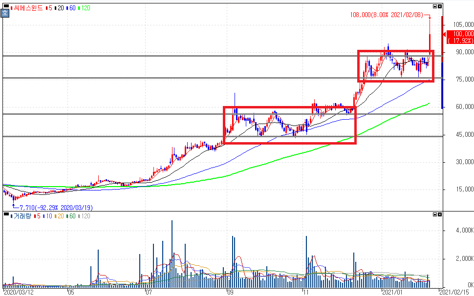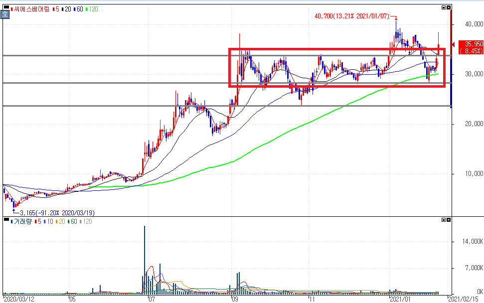 점진적으로 상승세를 보였던 씨에스윈드는 두 구간에서 일정 가격대를 유지하는 모습을 보인 이후 상승세를 보였다는 것을 알 수 있습니다. 구간을 구체화해서 본다면 박스권 내에서 재료와 수급에 대한 지표들을 종합해서 본다면 좋은 발굴종목을 볼 수 있습니다.