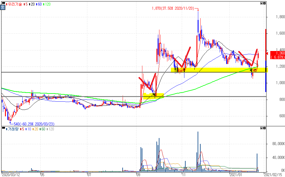 앞서 봤던 씨에스윈드와 마찬가지로 일정한 가격대를 유지하면서 박스권을 형성해왔다는 것을 알 수 있습니다. 풍력발전 관련주 종목들의 대다수가 약 5~6개월간 위처럼 박스권을 형성하거나 횡보세를 보여온 흐름에서 나온 부각입니다.