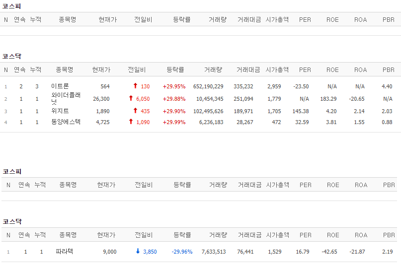 코스피에서는 상한가 종목이 없었고, 코스닥에서는 이트론, 와이더플래닛, 위지트, 동양에스텍이 상한가를 기록했습니다. 코스닥에서는 파라텍이 하한가를 기록했습니다.
