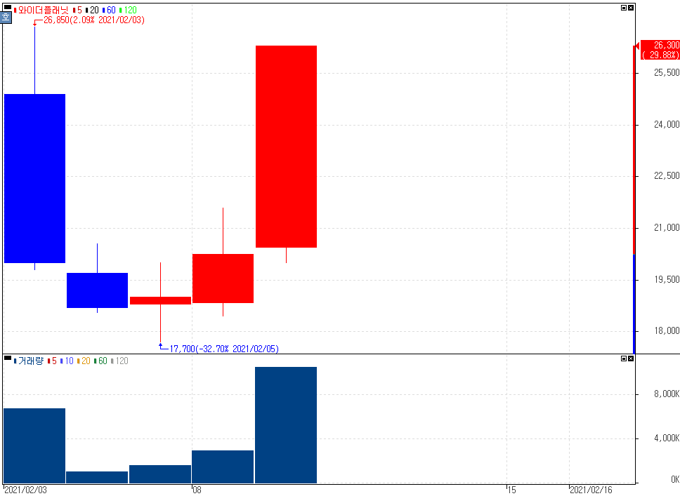 빅데이터 산업 기대감 속에 상한가를 기록한 와이더플래닛 주가 입니다. 와이더플래닛은 신규상장 5거래일째 강세를 보여주었습니다. 와이더플래닛이 빅데이터분석 및 솔루션 제공을 주사업으로 영위하는데 최근 中 시진핑이 "빅데이터 활용한 경제발전" 주문했다는 소식과 연결지어 볼 수 있습니다.