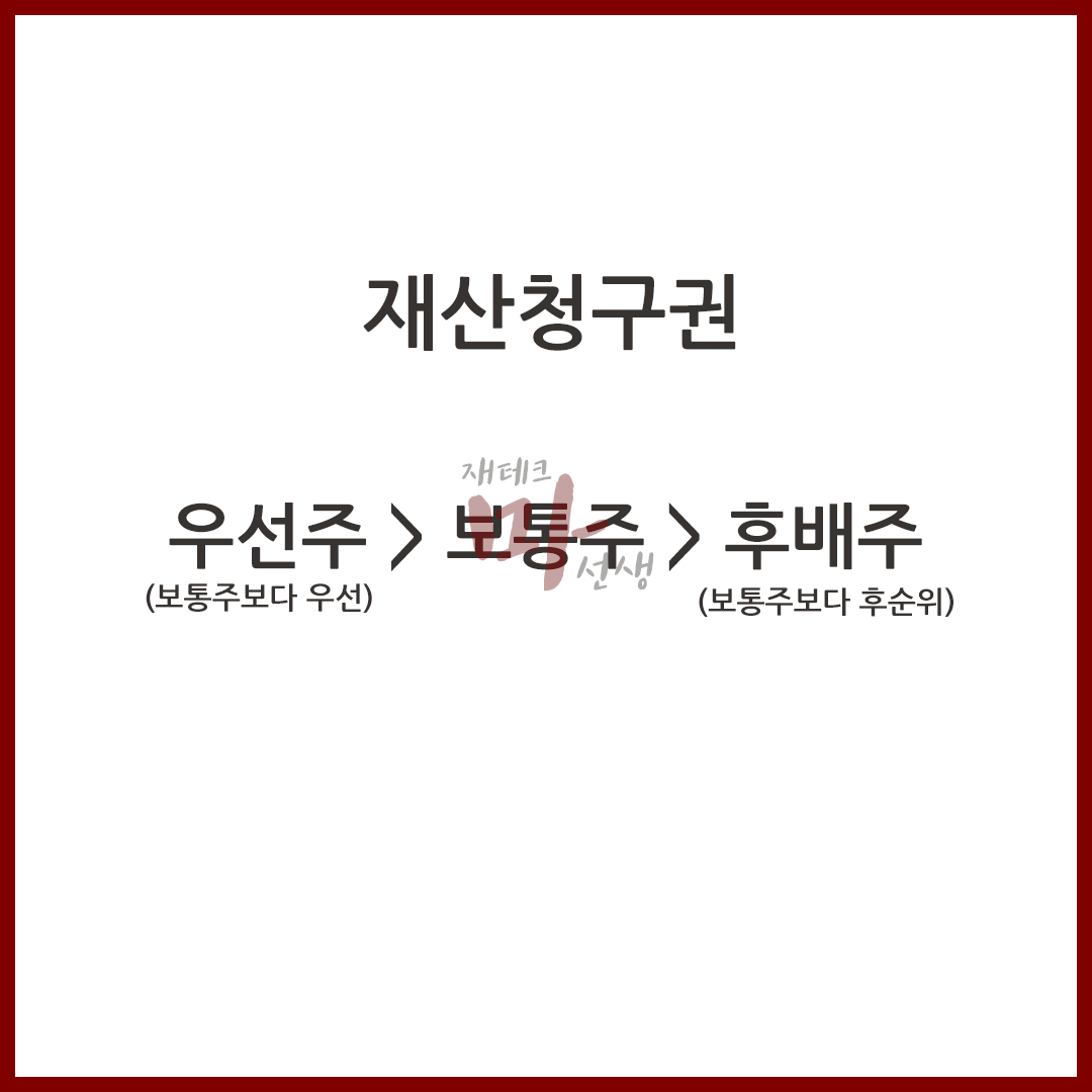 여기서 추가로 보통주를 기준으로 한 재산적 청구권이 후순위인 주식을 후배주라고 합니다.또한 여러가지의 권리 중에서 우선적 지위를 부여되는 것도 있으며, 후순위적 지위를 부여되는 주식도 있는 것을 혼합주라고 합니다.
