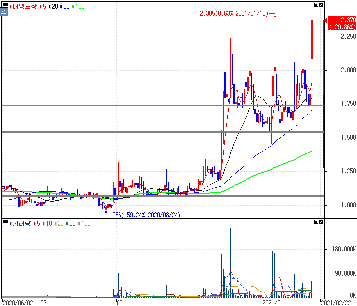 골판지 대란 속 쿠팡 미국 상장 소식과 함께 상한가를 기록한 대영포장, 영풍제지 주가 입니다. 대양제지 안산공장이 화재로 인한 영업정지를 하면서 골판지 원지 수급이 어려워진 상황에 쿠팡의 미국 상장 소식까지 겹치면서 골판지 수요에 대한 기대감이 더 부각 받고 있는 분위기 입니다.