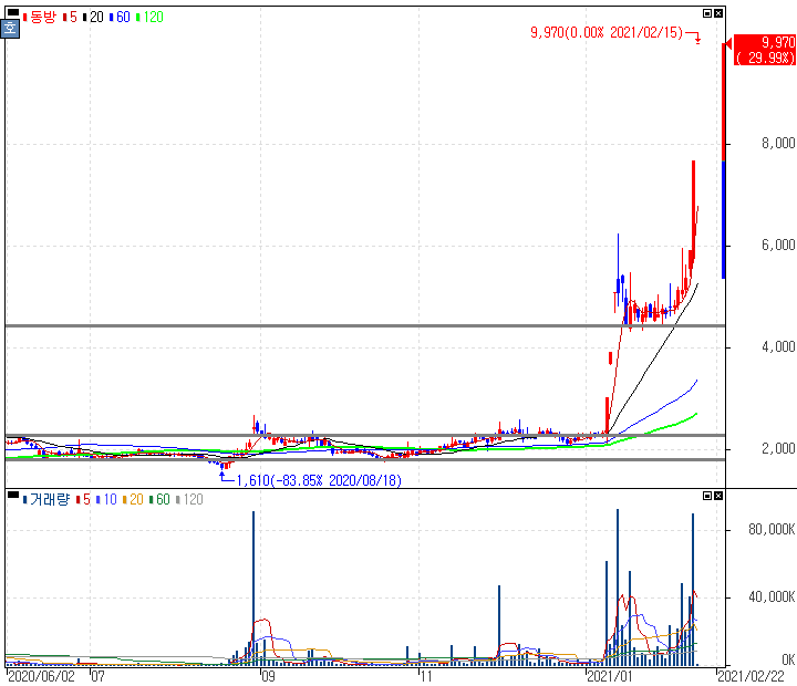 쿠팡 美 뉴욕증시거래소 상장 소식에 쿠팡 관련주 상한가를 기록한 동방, KCTC, 한국전자홀딩스, KTH, 미래생명자원 주가 입니다.