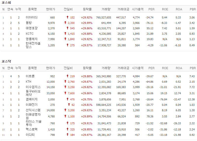 코스피에서는 이아이디, 동방, 대영포장, KCTC, 영풍제지, 한국전자홀딩스가 상한가를 기록했고, 코스닥에서는 이트론, KTH, 이수앱지스, 동구바이오제약, 썸에이지, 이화전기, 선익시스템, 미래생명자원, 리더스기술투자, 맥스로텍, 이디티가 상한가를 기록했습니다.