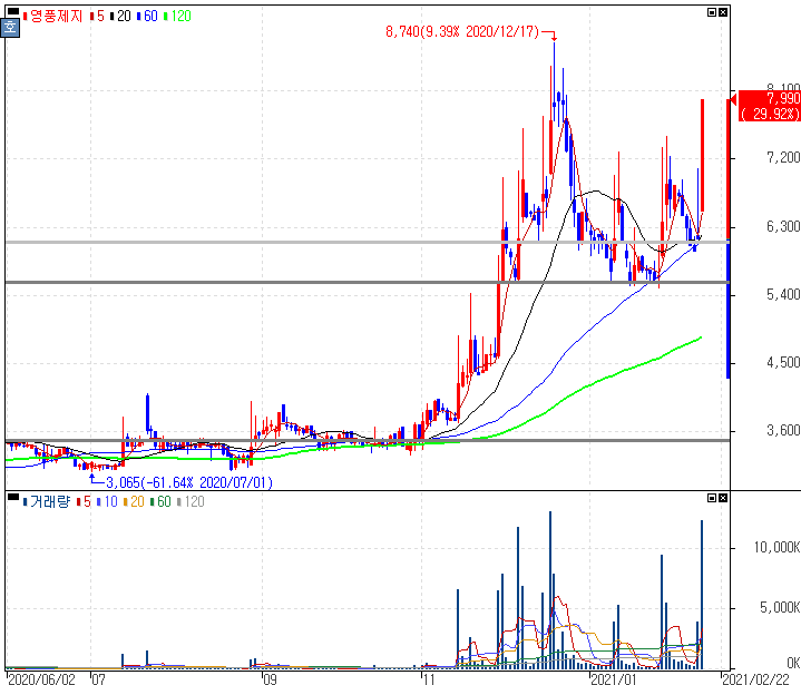 골판지 대란 속 쿠팡 미국 상장 소식과 함께 상한가를 기록한 대영포장, 영풍제지 주가 입니다. 대양제지 안산공장이 화재로 인한 영업정지를 하면서 골판지 원지 수급이 어려워진 상황에 쿠팡의 미국 상장 소식까지 겹치면서 골판지 수요에 대한 기대감이 더 부각 받고 있는 분위기 입니다.