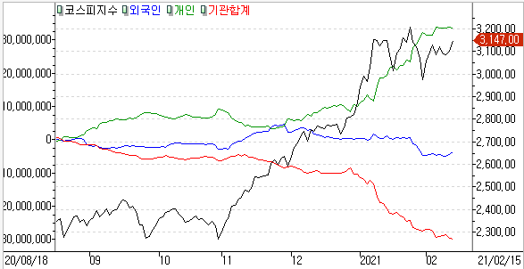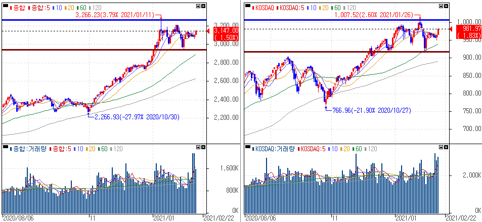 금일 코스피 지수는 +1.50% 상승한 3,147.00에 마감하였고, 코스닥 지수는 +1.83% 상승한 981.97에 마감하였습니다. 명절 연휴가 끝나고 외국인 순매수세가 상당히 들어오면서 상승을 보여주고 있는 상황입니다.