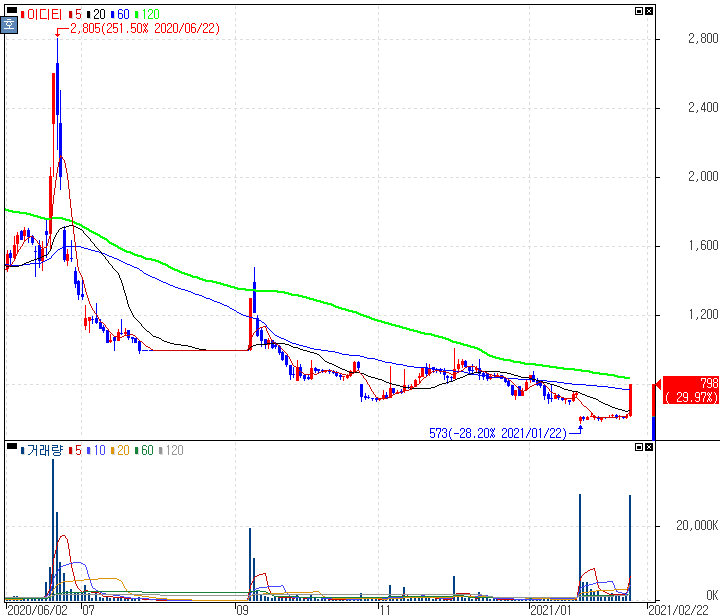 이에 지분관계를 확인해두자면 이아이디는 이트론의 지분을 보유, 이트론은 이화전기의 지분을 보유, 이화전기는 이트론의 지분을 보유하고 있습니다. 즉, 게열회사로 이아이디, 이트론, 이화전기 그리고 오늘 동반상한가를 기록한 이디티도 계열회사로 이화전기공업의 지분을 보유하고 있습니다.