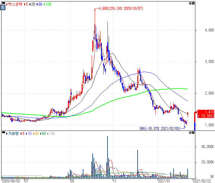 59.98억원 규모 제3자배정 유상증자 결정 속 상한가를 기록한 맥스로텍 주가 입니다. 운영자금 등 확보 목적으로 에이치비홀딩스를 대상으로 6,140,000주를 59.98억원 규모로 제3자배정 유상증자를 결정했습니다. 발행가는 977원으로 오는 3월 4일 추가상장 예정으로 최대주주가 비클시스템에서 에이치비홀딩스로 변경됩니다.