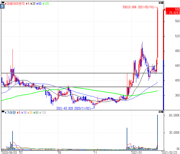지난해 호실적 및 박영선 테마주 편입되면서 상한가를 기록한 미래아이앤지 주가 입니다. 미래아이앤지는 지난해 실적발표 연결기준 전년대비 매출액 -21.68% 감소한 58.55억원을 기록했지만 영업이익에서 +461.69% 증가한 7.71억원을 기록했습니다.