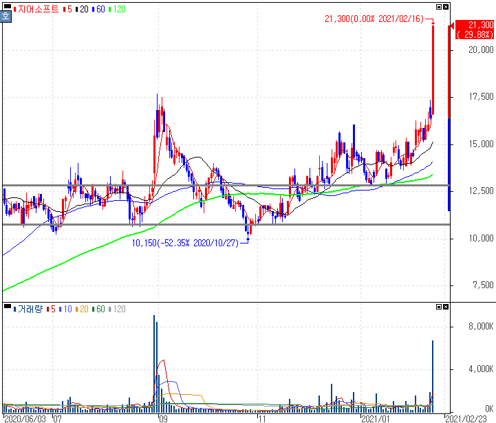지난해 흑자전환 및 쿠팡 美 상장으로 이커머스 시장 수요 증가 기대감에 상한가를 기록한 지어소프트 주가 입니다. 지난해 지어소프트는 연결기준 전년대비 매출액 62% 증가한 2588억 8980만원, 영업이익 흑자전환한 99억 9403만원을 기록했습니다.