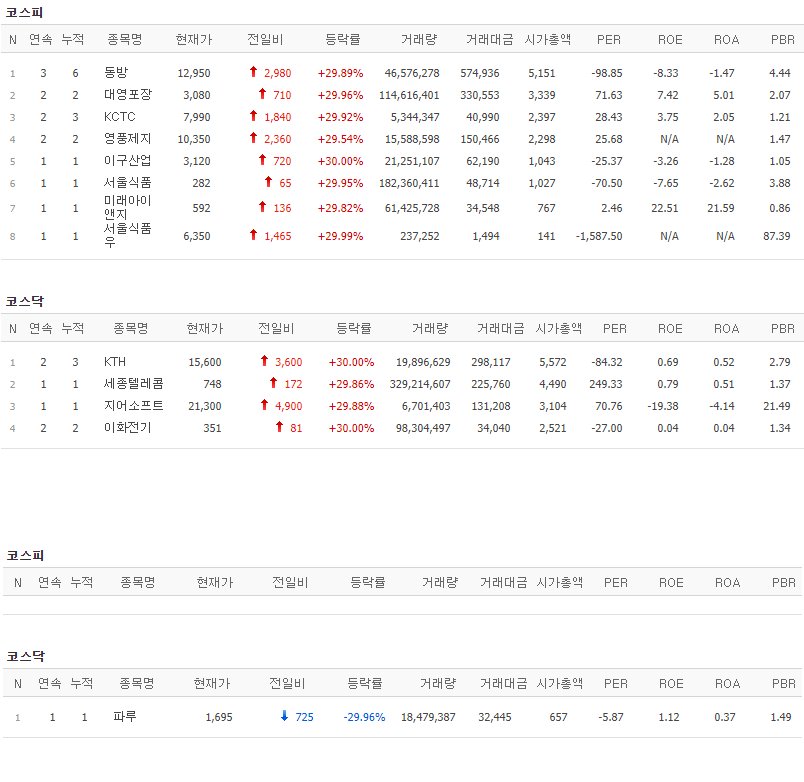 코스피에서는 동방, 대영포장, KCTC, 영풍제지, 이구산업, 서울식품, 미래아이앤지, 서울식품우가 상한가를 기록했고, 코스닥에서는 KTH, 세종텔레콤, 지어소프트, 이화전기가 상한가를 기록했습니다. 반면 코스닥에서 파루가 하한가를 기록했습니다.