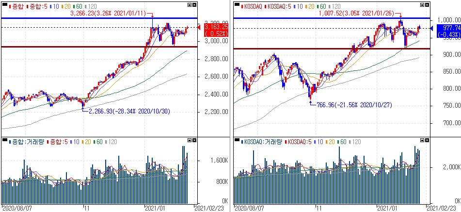 금일 코스피 지수는 +0.52% 상승한 3,163.25에 마감하였고, 코스닥 지수는 -0.43% 하락한 977.74에 마감하였습니다. 실적악화 종목 및 일부 바이오주 하락이 시장상승의 발목을 잡은 분위기이였습니다.