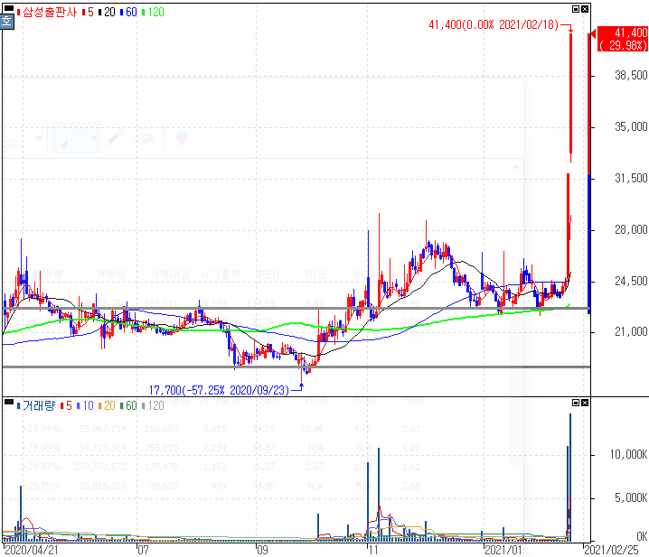관계사 스마트스터디 미국 나스닥 상장설 2거래일 연속 상한가를 기록한 삼성출판사 주가 입니다. 스마트스터디는 과거 '아기상어'로 크게 히트쳤던 동요로 크게 주목 받았던 업체입니다. 스마트스터디가 상장된 회사가 아니다보니 흔히 '아기상어 관련주'로 삼성출판사를 거론되어 왔었습니다.