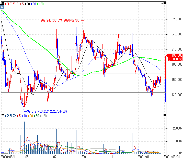 美 보톡스 분쟁 합의 소식 속 상한가를 기록한 메디톡스 주가 입니다. 메디톡스와 대웅제약의 보톡스균 도용 여부를 뚤러싼 미국 국제무역위원회 소송이 있었죠. 이번 합의는 대웅제약의 美 파트너사 에볼루스는 메디톡스와 엘러간에 합의금 3,500만 달러 한화로 약 380억원을 2년간 지불하게 됩니다.