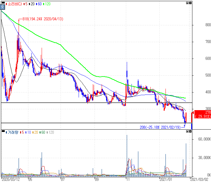 일단 소리바다가 지난 3분기에 영업손실과 당기순손실을 지속하면서 5년 연속 적자지속을 막고자 한 패션, 마스크 신사업이 어느정도 역할을 해줄 수 있을지 상황 속에서 나온 상한가로 보는 시각도 있습니다. 그보다 일단 안정적인 종목을 보는 시각이 좋습니다.
