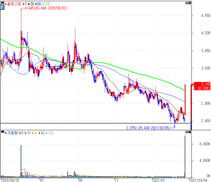 홈캐스트 주가 :: 2021년 02월 25일 오늘의 상한가 종목