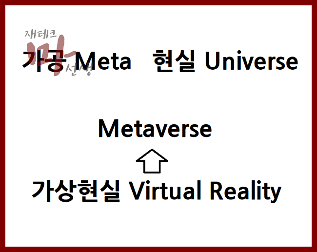 메타버스는 현실세계를 뜻 의미하는 '유니버스'와 추상, 가공을 의미하는 메타의 합성어로 가상세계를 뜻하는 의미하는 메타버스입니다. 그동안 가상현실이라고 사용해왔는데 진보된 개념으로 메타버스라는 단어가 주로 사용됩니다.