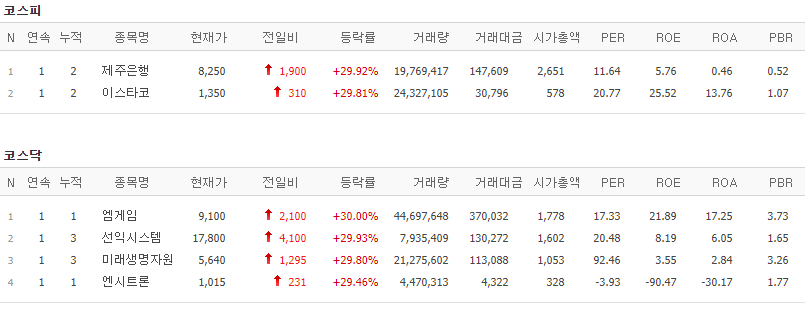 코스피에서는 제주은행, 이스타코가 상한가를 기록했고, 코스닥에서는 엠게임, 선익시스템, 미래생명자원, 엔시트론이 상한가를 기록했습니다.