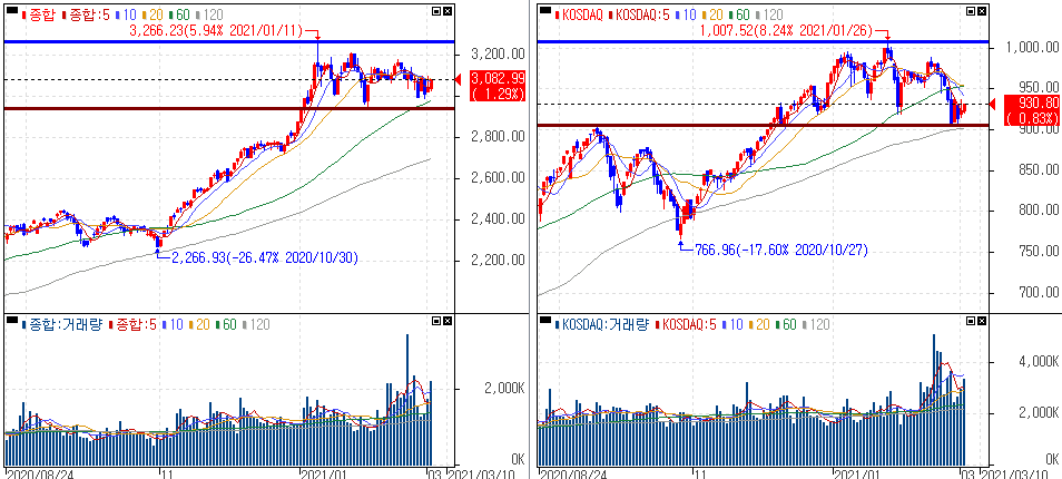 금일 코스피 지수는 +1.29% 상승한 3,082.99에 마감하였고, 코스닥 지수는 +0.83% 상승한 930.80에 마감하였습니다. 불안정한 요소들이 해소 되지 않은 상황에 하단에서 물량이 계속 쌓이는 모습을 보여주고 있습니다.
