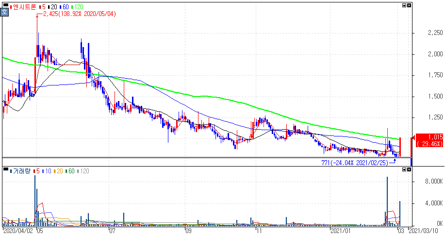 쿠팡 관련주로 편입되면서 상한가를 기록한 엔시트론 주가 입니다. 앞서 쿠팡의 뉴욕증권거래소 상장날이 임박했다는 것은 말씀드렸습니다. 엔시트론은 국내 쌀 도정업체인 한결물산과 쿠팡의 '곰곰쌀' 수매 협력을 추진하고 있다는 계획을 밝히면서 부각을 받았습니다.