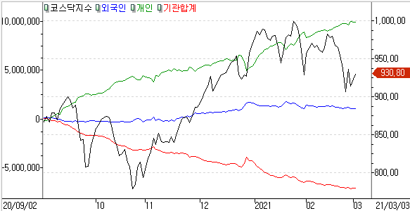 코스닥 개인 +355억 / 외국인 -152억 / 기관 +52억