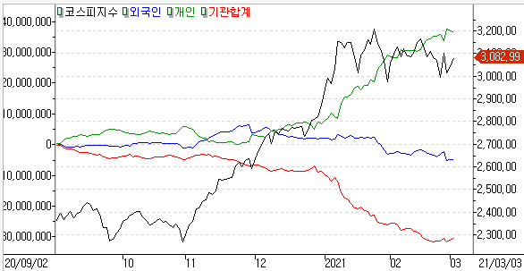 코스피 개인 -6,555억 / 외국인 -210억 / 기관 +6,911억