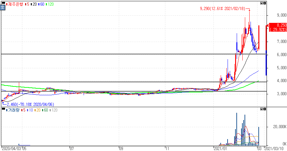 신한금융 매각, 네이버·NXC 인수설 및 가계부채 구조조정 시기 속 금리 인상 등에 따른 업황 개선 기대감 등에 상한가를 기록한 제주은행 주가 입니다. 제주은행 매각설이 돌면서 심지어 네이버, NXC가 인수한다는 소식까지 돌던 제주은행입니다.