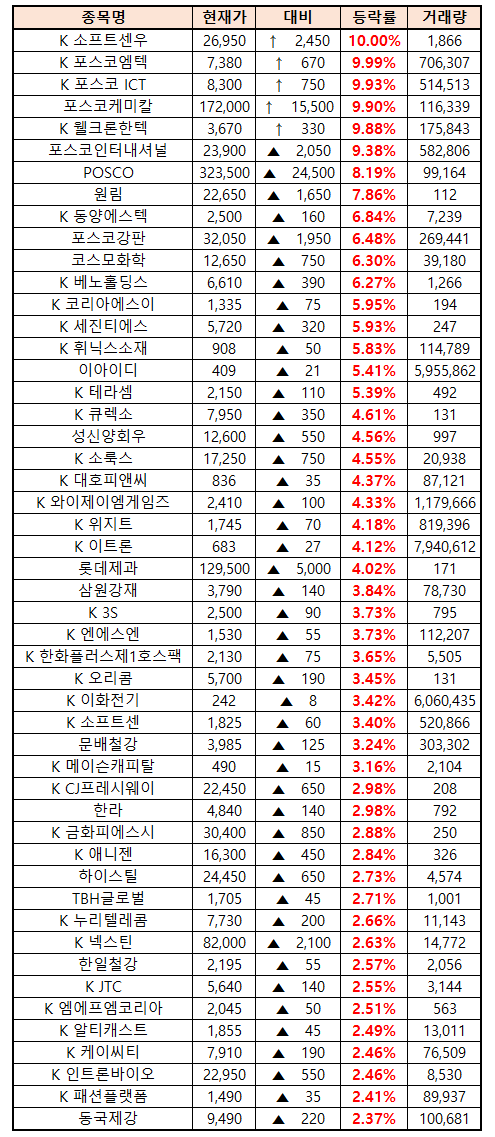 시간외 단일가매매 종가 종목 확인시 단순 급등주 등락률만 볼 것이 아니라, '거래량'에 따르는 거래대금도 판단하면서 보는 것이 중요합니다.