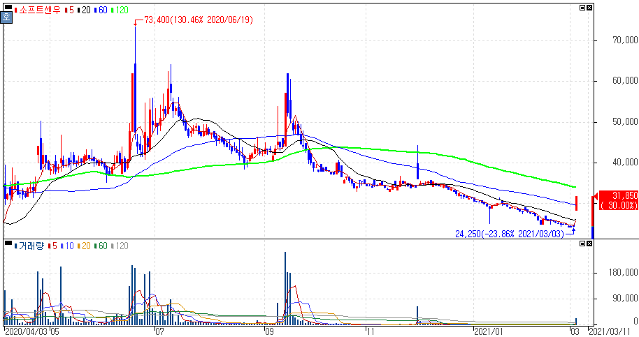 소프트센우 주가 차트에서는 지난 9월 이후 긴 하락세를 보인 종목입니다. 투자자에 따라서 이런 종목을 쉽게 수익을 내는 분들도 계시는데 개인적으로는 좀 더 확고히 안정성을 가진 종목을 보는 것도 좋다고 봅니다. 보통주 소프트센은 +3.40%으로 상승마감하였습니다.