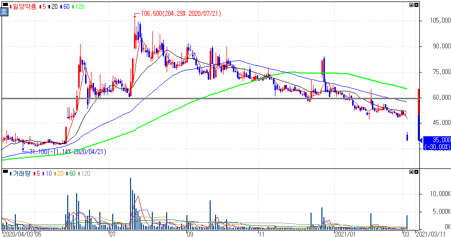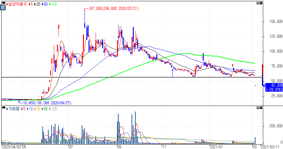 코로나19 치료제 라도티닙, 러시아 임상 3상 실패에 하한가를 기록한 일양약품, 일양약품우 주가 입니다. 라도티닙(Radotinib)의 코로나19 임상 3상을 러시아 R-PHARM社가 진행하였으나, 표준 권장 치료보다 우수한 효능을 입증하지 못하였다고 공시되었습니다.