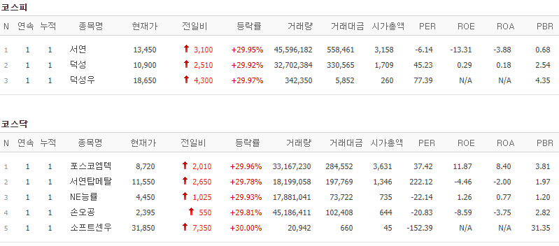 코스피에서는 서연, 덕성, 덕성우가 상한가를 기록했으며, 코스닥에서는 포스코엠텍, 서연탑메탈, NE능률, 손오공, 소프트센우가 상한가를 기록했습니다. 반면 코스피에서 일양약품, 일양약품우, 성안이 하한가를 기록했습니다.