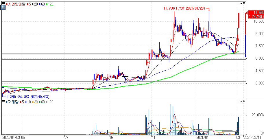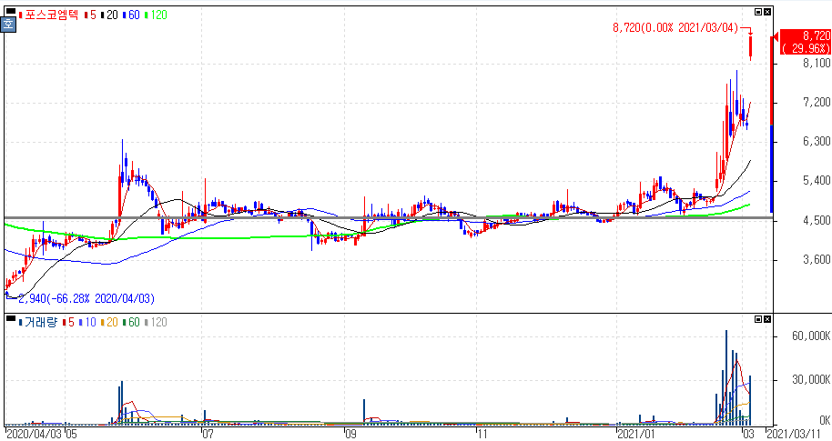 포스코가 3년전 인수한 리튬 염호 가치 35조원으로 급등 소식에 상한가를 기록한 포스코엠텍 주가 입니다. 2018년에 포스코가 아르헨티나 옴브레 무에르토 염호에 매장된 리튬을 생산해 현 시세로 적용해 판매하면 누적 매출액 35조원에 달할 것이라는 소식에 부각을 보였습니다.