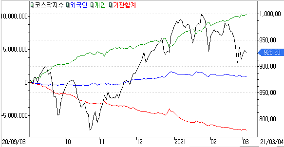 코스닥 개인 +1,659억 / 외국인 -1,050억 / 기관 -589억