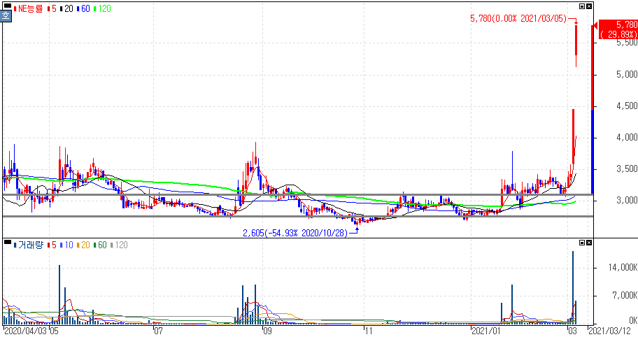 윤석열 검찰총장 전격 사의 표명 및 즉각 수용 소식에 연속 상한가를 기록한 NE능률 주가 입니다. 윤석열 테마주 NE능률이 오늘도 강세 흐름을 보였습니다.