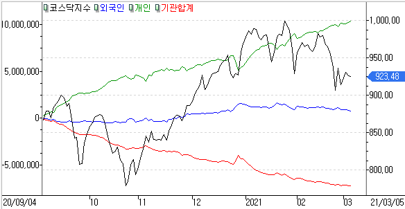 코스닥 개인 +1,322억 / 외국인 -1,113억 / 기관 -244억