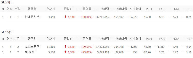 코스피에서는 현대퓨쳐넷이 상한가를 기록했고, 코스닥에서는 포스코엠텍, NE능률이 상한가를 기록했습니다.