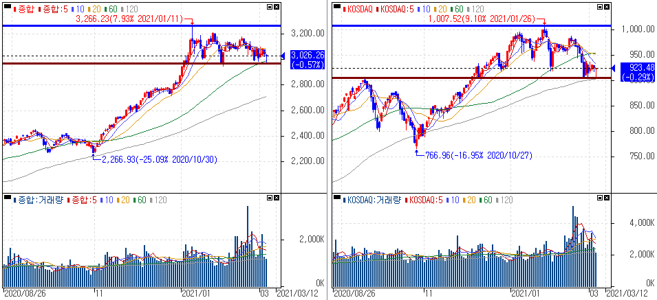 금일 코스피 지수는 -0.57% 하락한 3,026.26에 마감하였고, 코스닥 지수는 -0.29% 하락한 923.48에 마감하였습니다. 미국發 금리이슈가 여전히 이어지면서 국내증시 조정도 함께 길어지는 모습입니다.