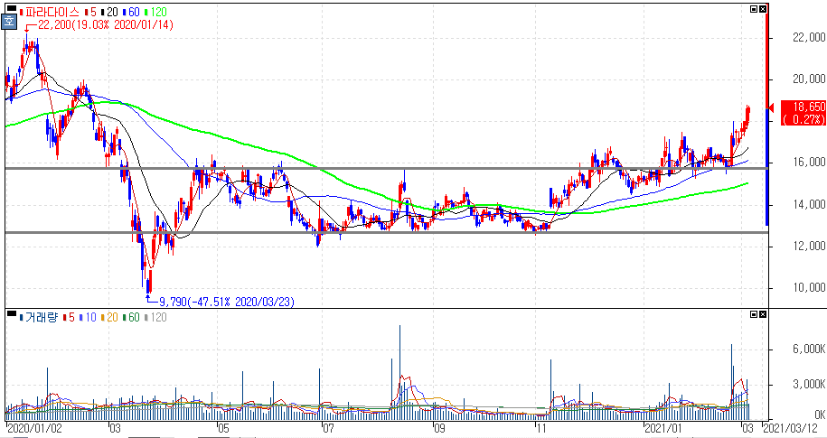 파라다이스는 외국인 전용 카지노 사업을 운영하면서 서울, 부산, 인천 그리고 제주 지역에 카지노 영업장이 있습니다. 파라다이스 주가 차트에서 볼 수 있듯이 지난 한해는 코로나19로 타격을 제대로 받았다는 것을 알 수 있습니다. 그러나, 11월부터 백신 접종에 대한 구체적인 양상과 기대감과 함께 추세가 전환되면 국면을 보인다는 것을 알 수 있습니다.