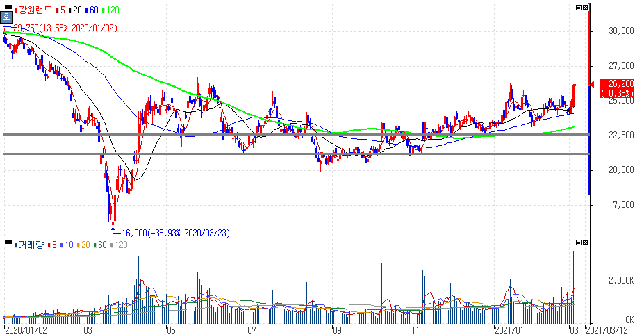 강원랜드는 국내에서 유일하게 내국인을 대상으로 카지노를 운영하고 있는 업체입니다. 해외 관광객을 대상으로 하지 않고 내국인을 대상으로 하다보니 국내 분위기에 더 밀접하게 볼 수도 있습니다. 어쨌거나 카지노 관련주 종목으로 앞서 봤던 다른 카지노 종목들과 크게 다를 것이 없는 흐름이라는 것을 알 수 있습니다.