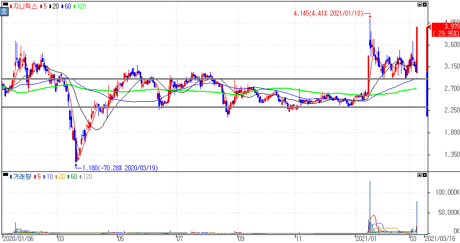 삼성전자 세계최초 20조 조채혈 혈당 측정 스마트워치 소식에 상한가를 기록한 지니틱스 주가 입니다. 혈압과 심전도 및 산호포화도에 이어 혈당 측정 기능을 탑재한 삼성전자 차기 스마트워치가 올 2분기 중 출시 될 것이라는 전망에 전 세계 웨어러블 터치IC 시장 점유율 1위 업체인 지니틱스가 부각을 보였습니다.