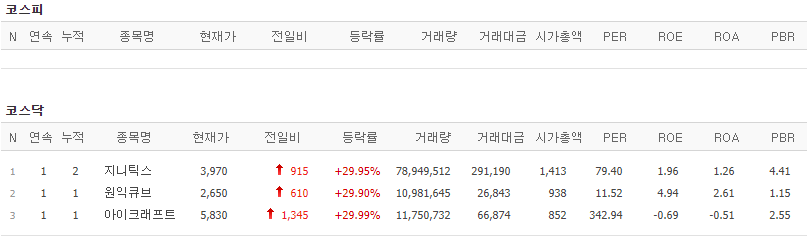 코스피에서는 상한가 종목이 없었고, 코스닥에서는 지니틱스, 원익큐브, 아이크래프트가 상한가를 기록했습니다.