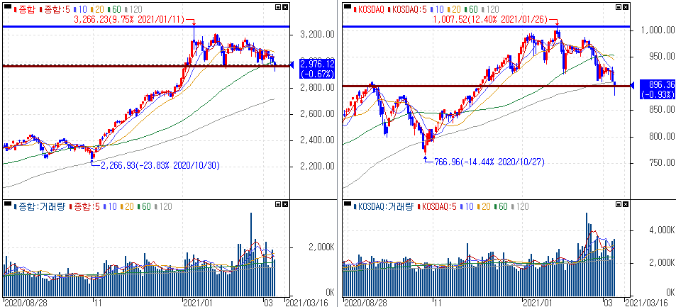 금일 코스피 지수는 -0.67% 하락한 2,976.12에 마감하였고, 코스닥 지수는 -0.93% 하락한 896.36에 마감하였습니다. 지지구간을 오차범위내에서 큰 변동성을 보인 만큼 어느 방향으로 가닥이 잡힐지 중요한 시기입니다.